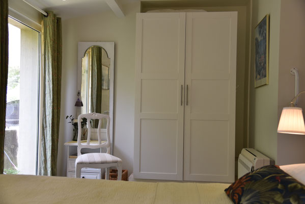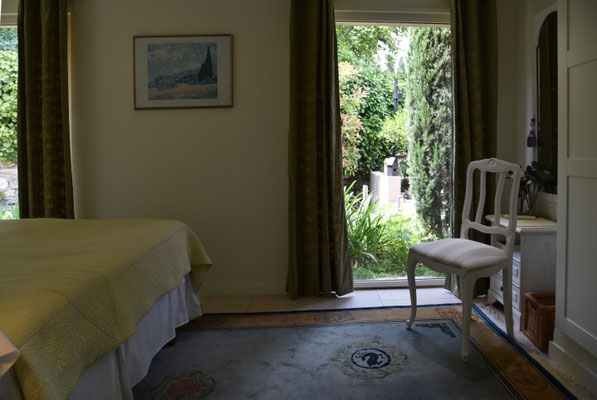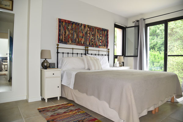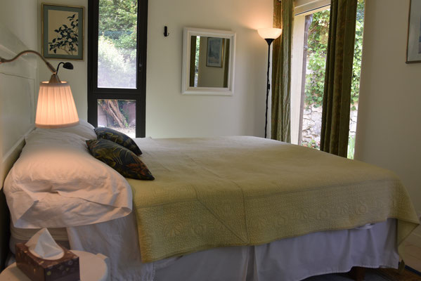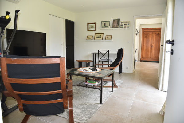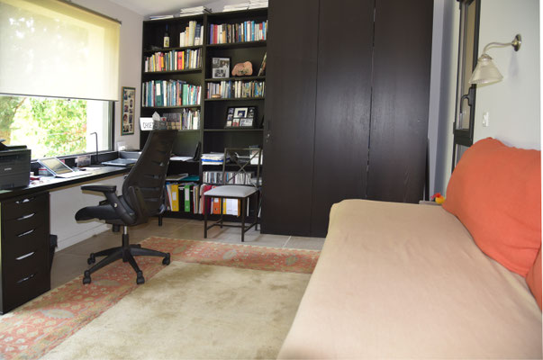 Um in das zweite Schlafzimmer mit Doppelbett zu gelangen, muss man vom Wohnraum aus zunächst durch ein kleines Fernsehzimmer, dann durch das Büro mit Schlafcouch und zuletzt einige Stufen hinunter gehen.