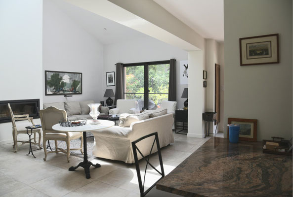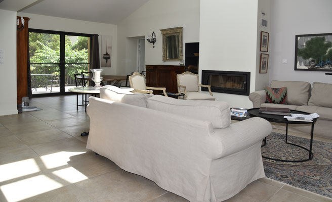 für den gemütlichen Aufenthalt im großzügigen, offenen Wohnbereich stehen ausreichend Sofas und Sessel bereit. Oberlichter machen den hohen Raum sehr hell.