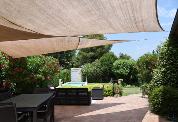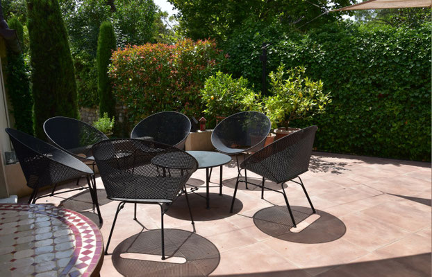 großzügige Terrasse mit einer Auswahl an Sitzmöglichkeiten auf der Poolseite,